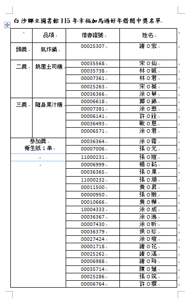 【抽獎公告】白沙鄉立圖書館幸福加馬過好年借閱中獎名單